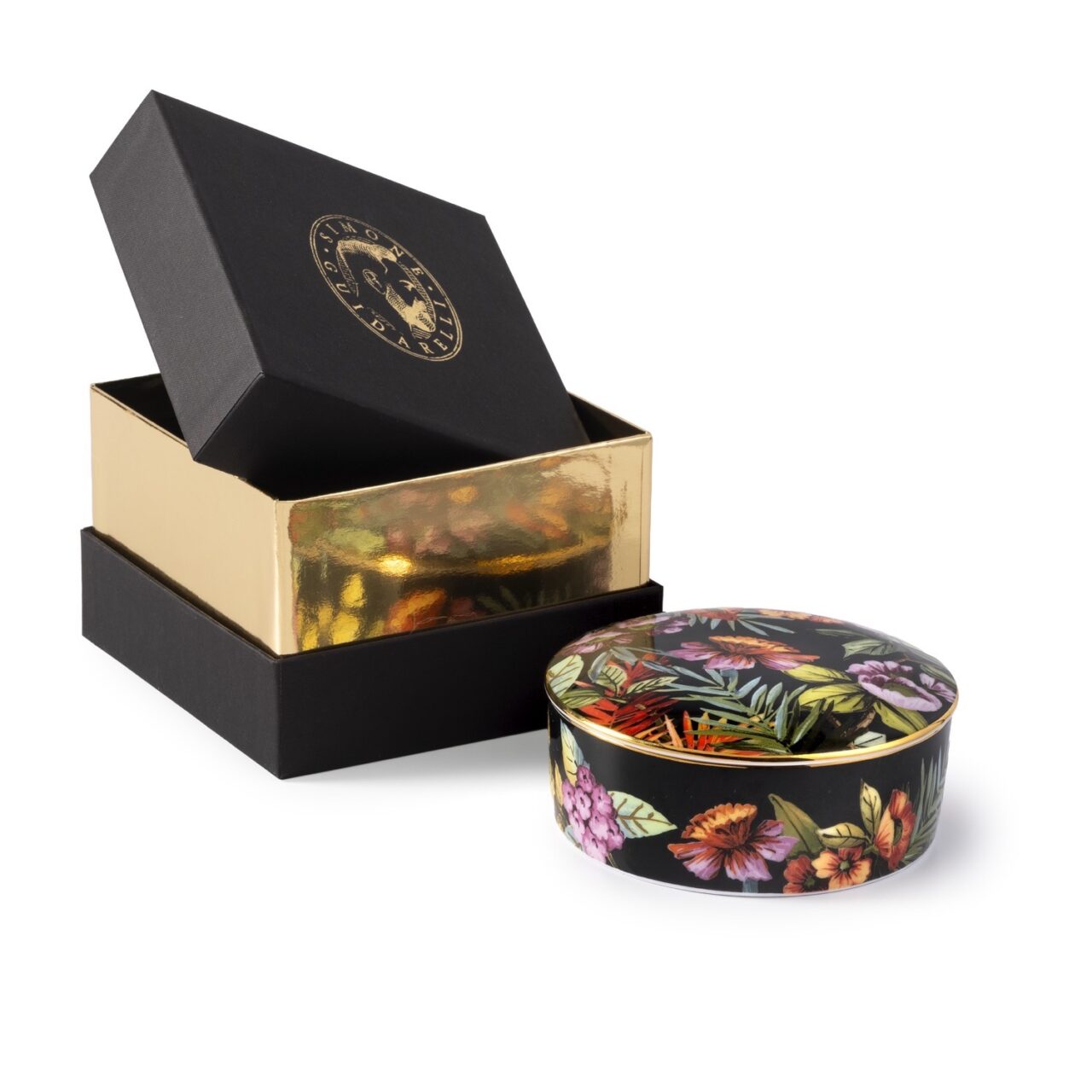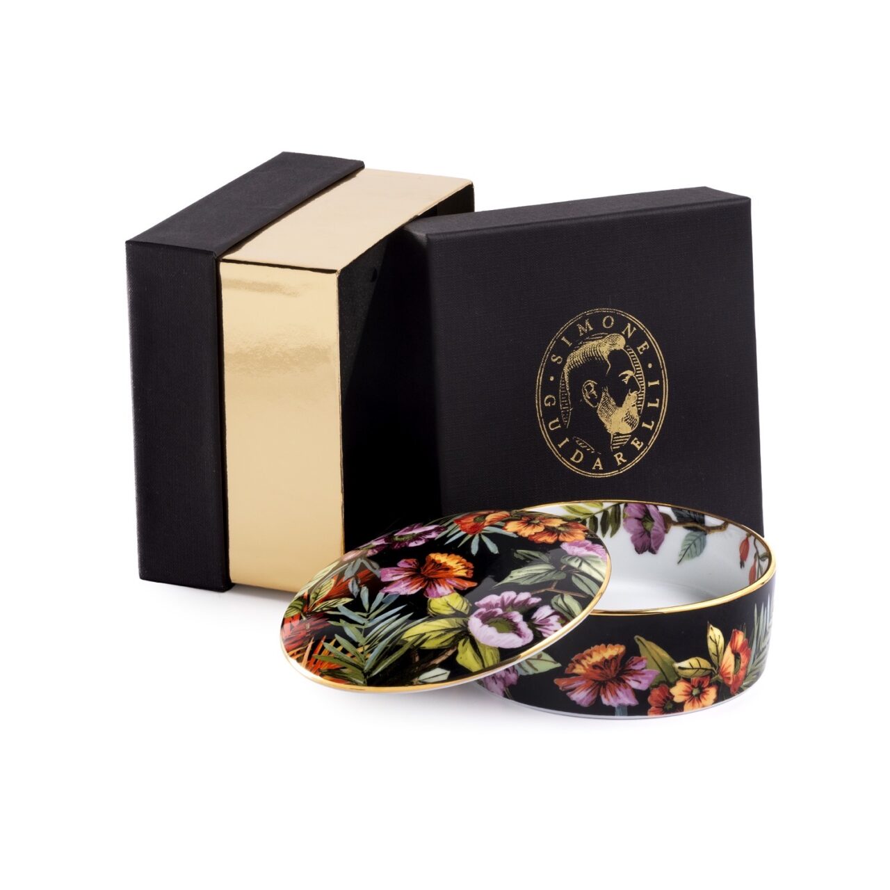 Porcelain jewelry box with lid hand finished with real gold thread .