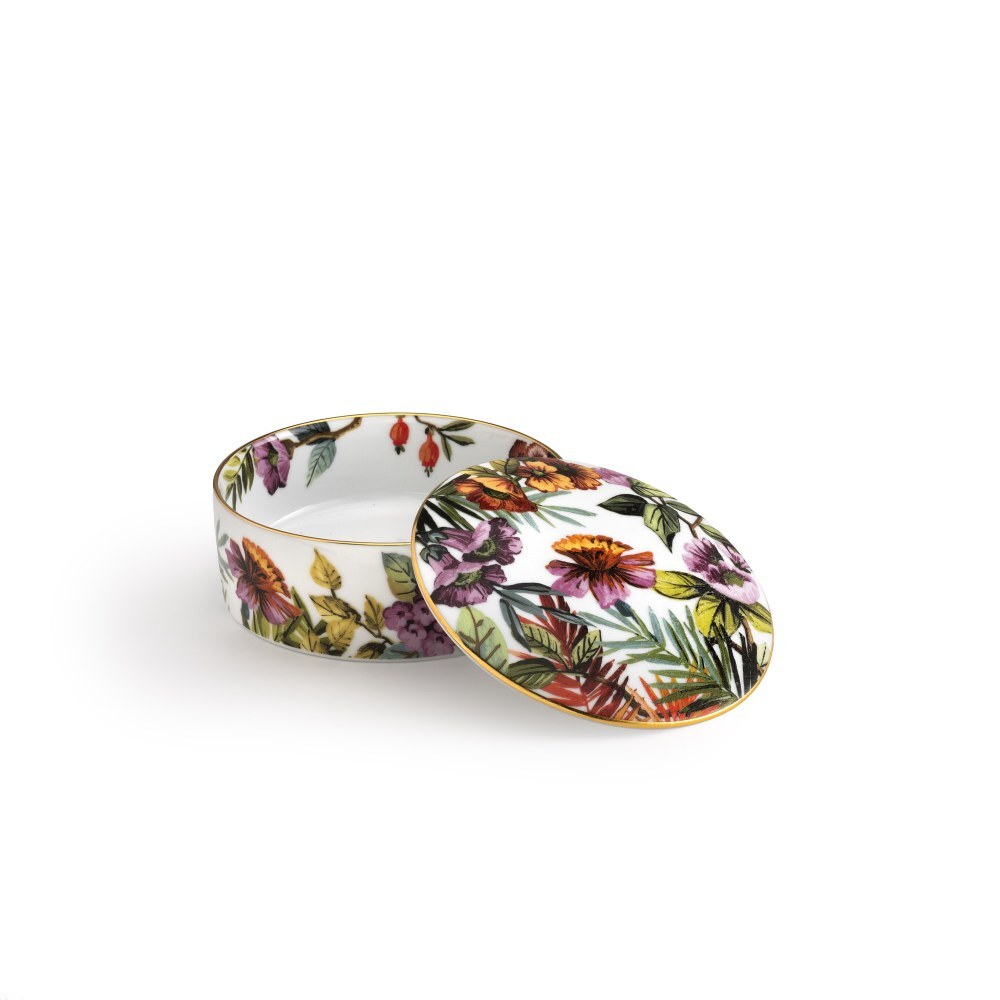 Porcelain jewelry box with lid hand finished with real gold thread .