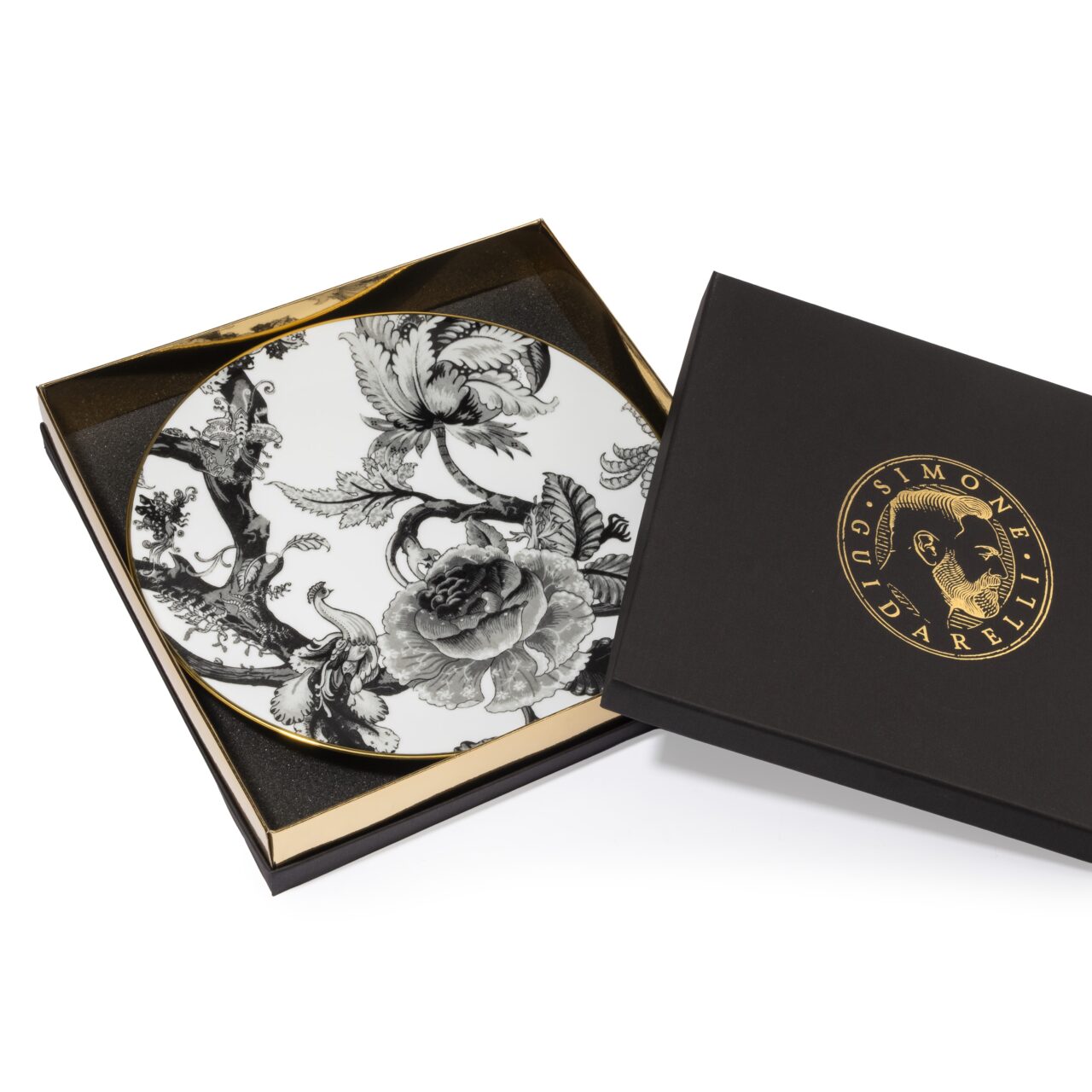 Finished with hand-applied 12 kt real gold trim.