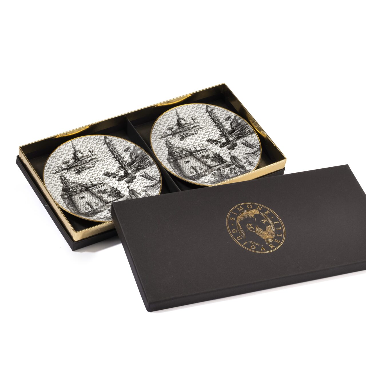 Finished with hand-applied 12 kt real gold trim.
